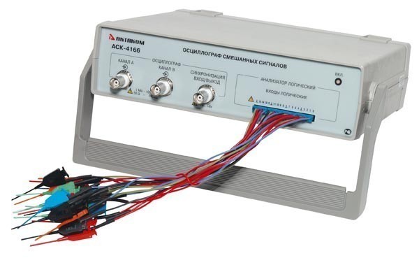 Комбинированный цифровой запоминающий осциллограф смешанных сигналов — приставка к компьютеру. Осциллограф АСК-4166 предназначен для наблюдения и анализа синхронных временных диаграмм цифровых и аналоговых сигналов, их отображения на мониторе компьютера, измерения параметров и математической обработки с помощью программного обеспечения.