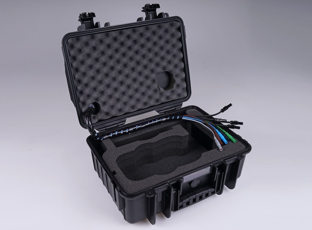 Кейс представляет собой пластиковый чемодан с кабельными вводами, через которые каналы измерения напряжения анализатора подключается к измеряемой электросети. Кроме этого в кейс вмонтированы несъёмные токоизмерительные клещи, которые надеваются на проводники измеряемой электросети и соединяются с анализатором посредством специальных кабелей внутри кейса.
