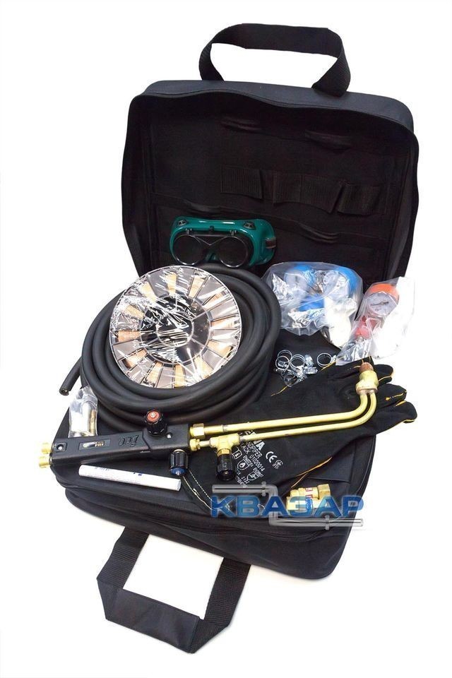 Набор инструментов состоит из 11 предметов, в том числе пропанового резака с насадками, редукторов, газового рукава, обратных клапанов, хомутов, защитных очков и перчаток, сварочной проволоки.