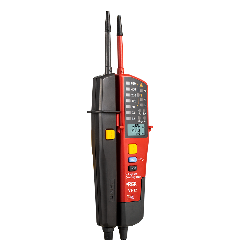 Измерения производятся почти мгновенно, результаты отображаются на дисплее крупным шрифтом и фиксируются с помощью кнопки HOLD для последующего анализа и документации. Электрический тестер RGK VT-12 автоматически подстраивается под ток нагрузки и сигнализирует о перегрузке. Режим тестирования УЗО активируется отдельно специальными кнопками на щупах. Светодиодные индикаторы указывают на уровень напряжения, полярность и вращение фазы.