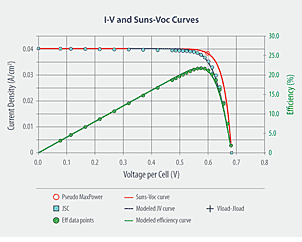 Пакет анализа Sinton включает в себя стандартные результаты тестирования ячеек. Эти стандартные результаты дополняются анализом Suns-Voc, который точно указывает на источник потери мощности с помощью точных измерений шунтирующего и последовательного сопротивления.