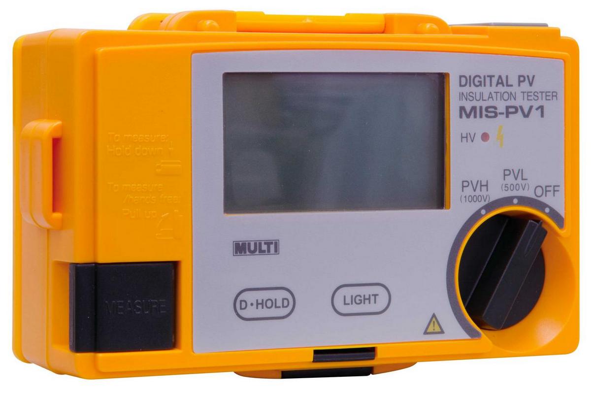Измеритель сопротивления изоляции MIS-PV1 создан для использования в фотогальванических системах. Предел измерения сопротивления изоляции 100 МОм и 2 ГОм непосредственно во время генерации энергии солнечными батареями в линиях до 500 В и до 1000 В соответственно, базовая погрешность ±5 %, максимальное разрешение 1 кОм, ЖК-дисплей с подсветкой (разрешение 3200), удержание показаний, автоотключение через 10 минут.