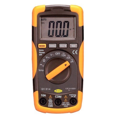 Мультиметрцифровой DT-914 оснащен также функциями измерения силы тока (10A), сопротивления (20MОм). Отличительной особенностью данной модели является наличие функций прозвонки цепей и теста диодов. При помощи термопары К-типа, входящей в комплект прибора, вы можете измерять температуру в диапазоне от -50°С до +1000°С в любых труднодоступных местах.
