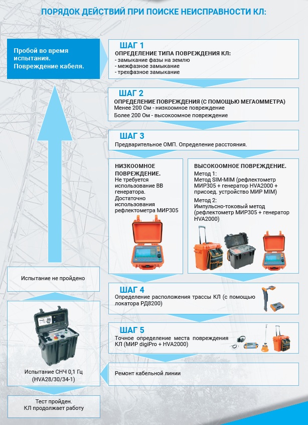 Порядок действий при поиске неисправности КЛ с помощью приборов линейки МИР